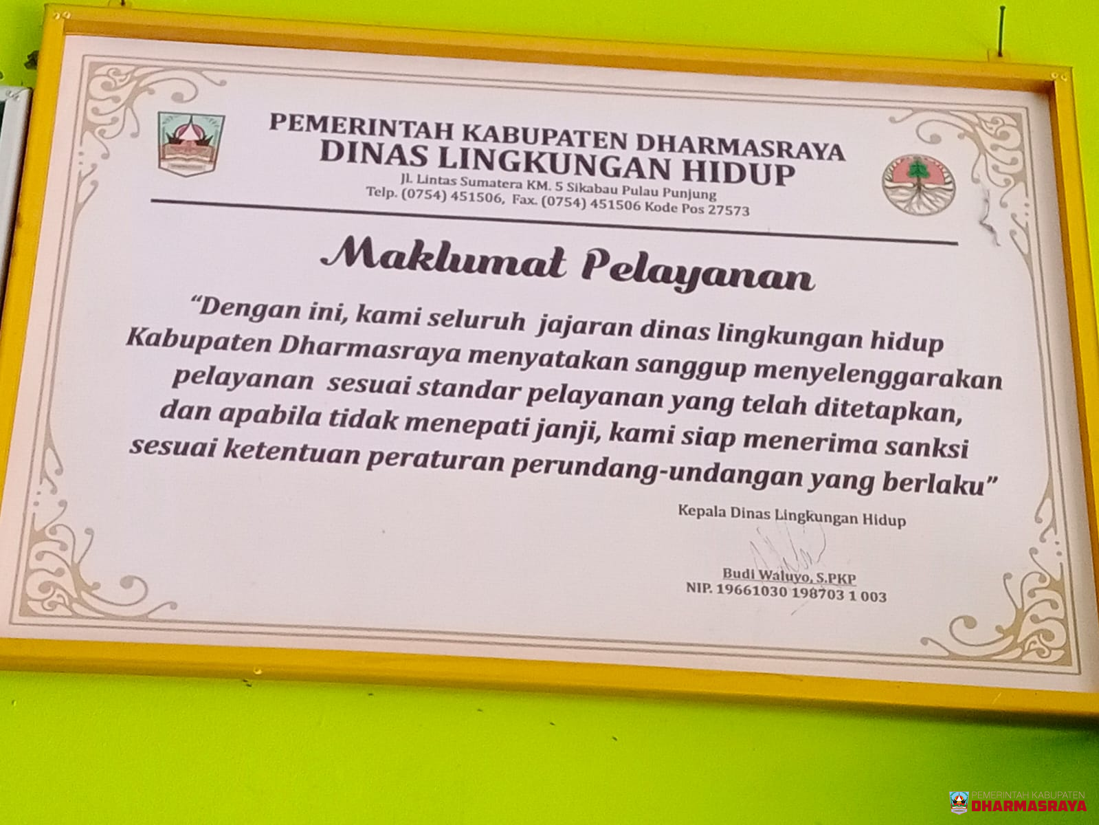 "Dengan ini, kami seluruh jajaran Dinas Lingkungan Hidup Kabupaten Dharmasraya menyatakan sanggup menyelanggarakan pelayanan sesuai standar pelayanan yang telah ditetapkan dan apabila tidak menepati janji, kami siap menerima sanksi sesuai ketentuan peraturan perundang-undangan yang berlaku"
